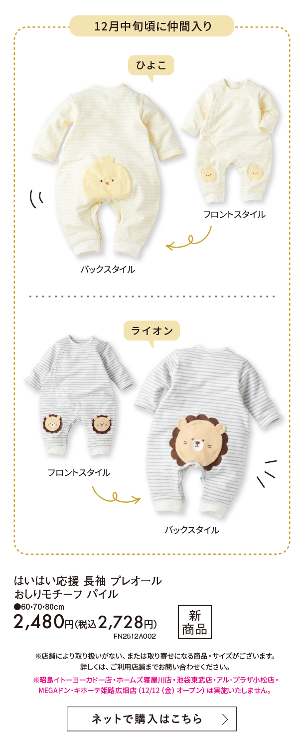 12月新商品情報|はいはい応援 長袖プレオール おしりモチーフ パイル|アカチャンホンポ