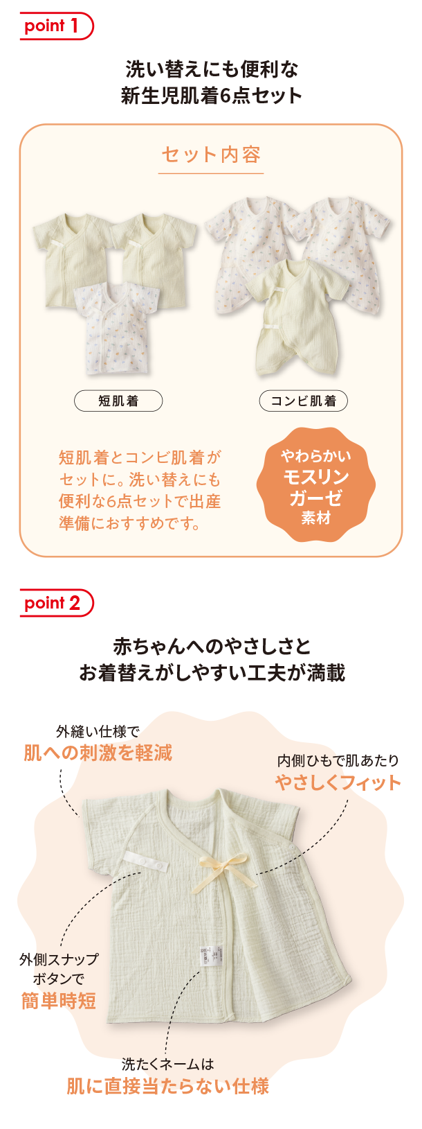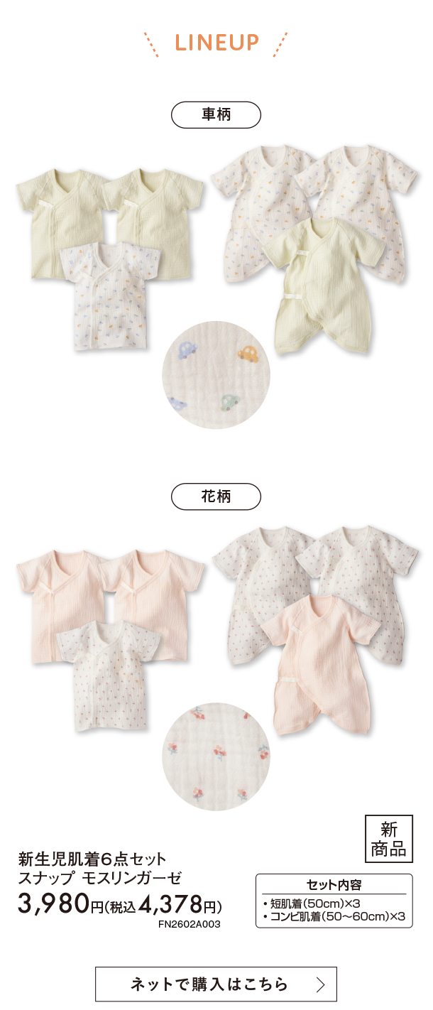 2月新商品情報|新生児肌着6点セット スナップ モスリンガーゼ|アカチャンホンポ