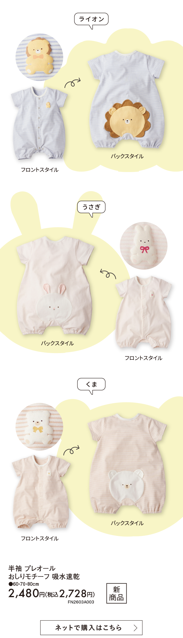 3月新商品情報|半袖プレオール おしりモチーフ 吸水速乾|アカチャンホンポ